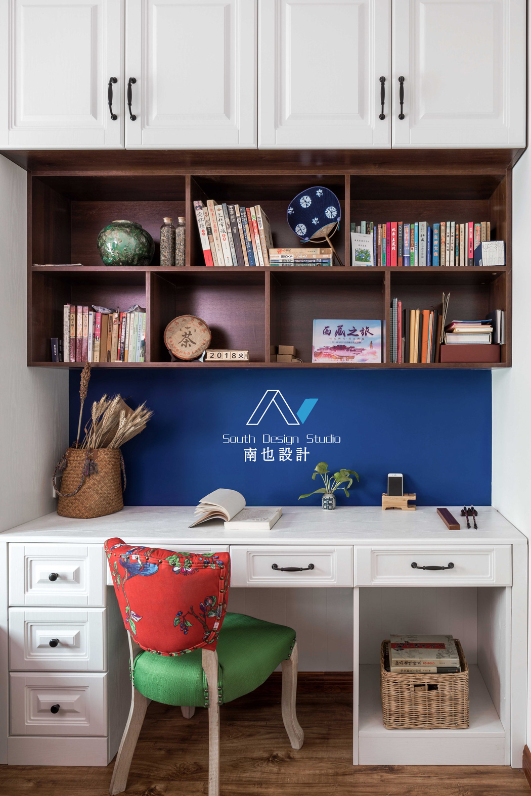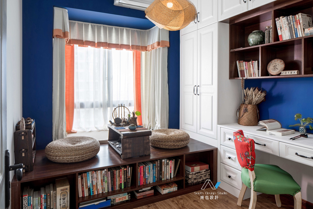 书房在设计之初,余姐就说书房希望能用“书皮蓝”,一头雾水的我猜测“书皮蓝”是不是像武侠剧里某个秘籍的书皮颜色,果不其然。这样的深蓝色和深木色搭配在一起异域感很强。原设计榻榻米是做到1.5宽,没有做底部书架。后来减到1米,余姐家里的书很多,希望有地方存放,而在底部开放式的书架,一开始我非常担心清洁问题,后来发现多虑了。开门书房门看到琳琅满目的书整齐的摆放在一起的时候,感觉整个空间的气质都不一样了。