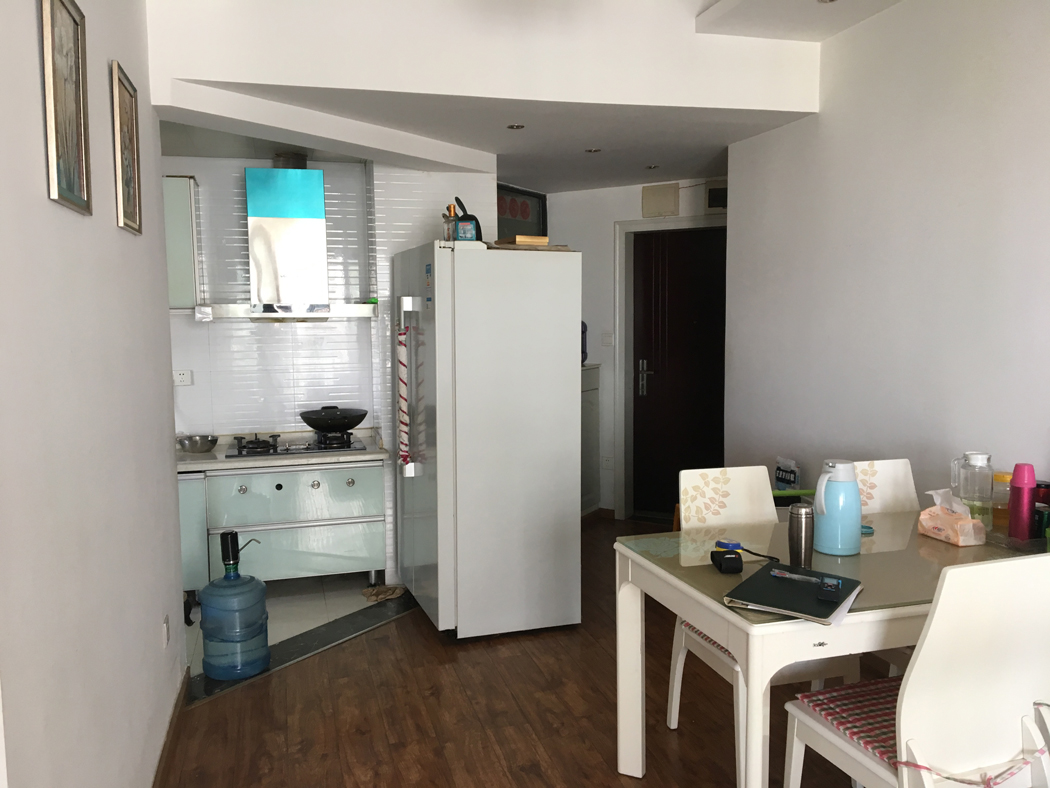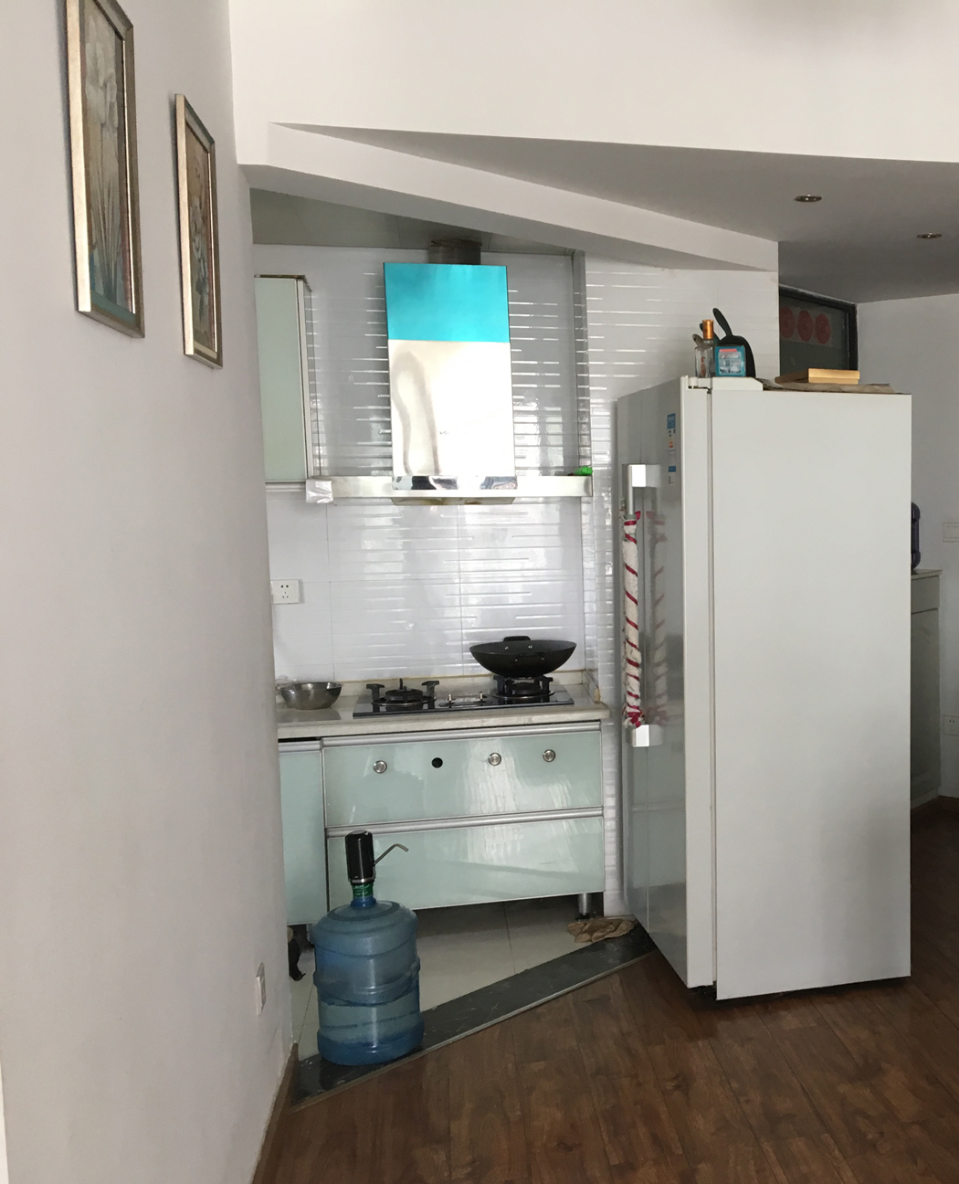 连接玄关的厨房区域,原来摆放的双开门大冰箱让空间太过拥挤。经过空间朝向和采光分析,结合业主平时的生活习惯。我们把冰箱位置挪动到阳台处。南北朝向,太阳基本不会直晒