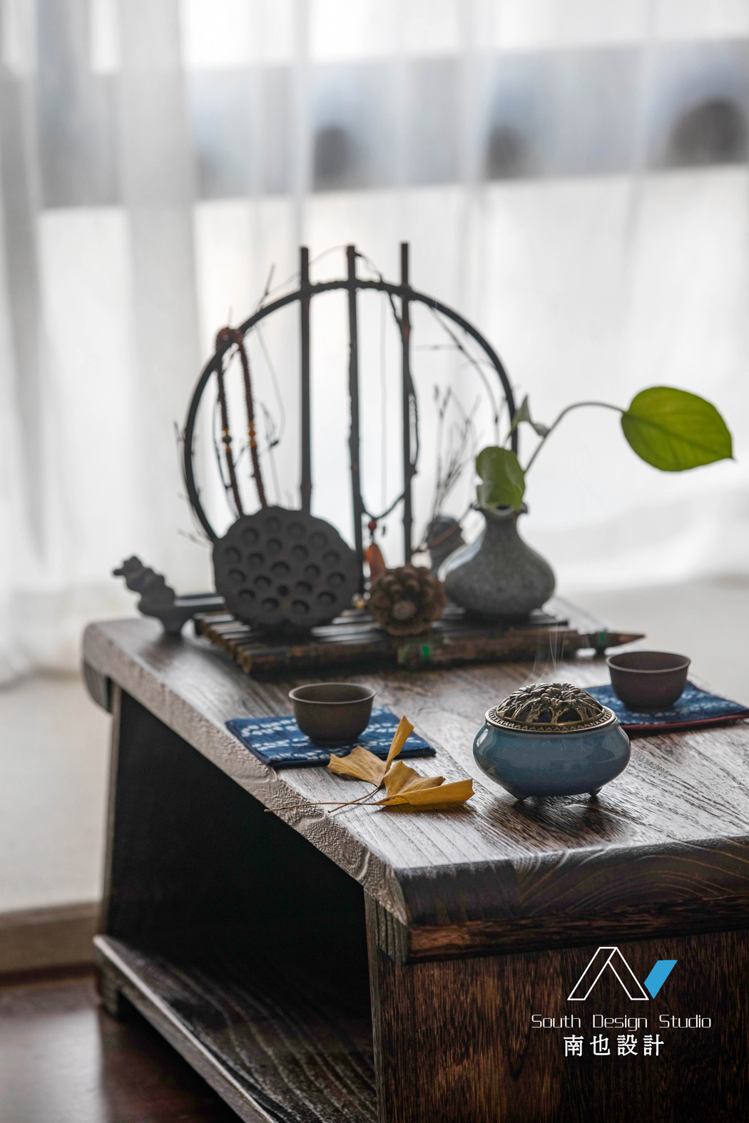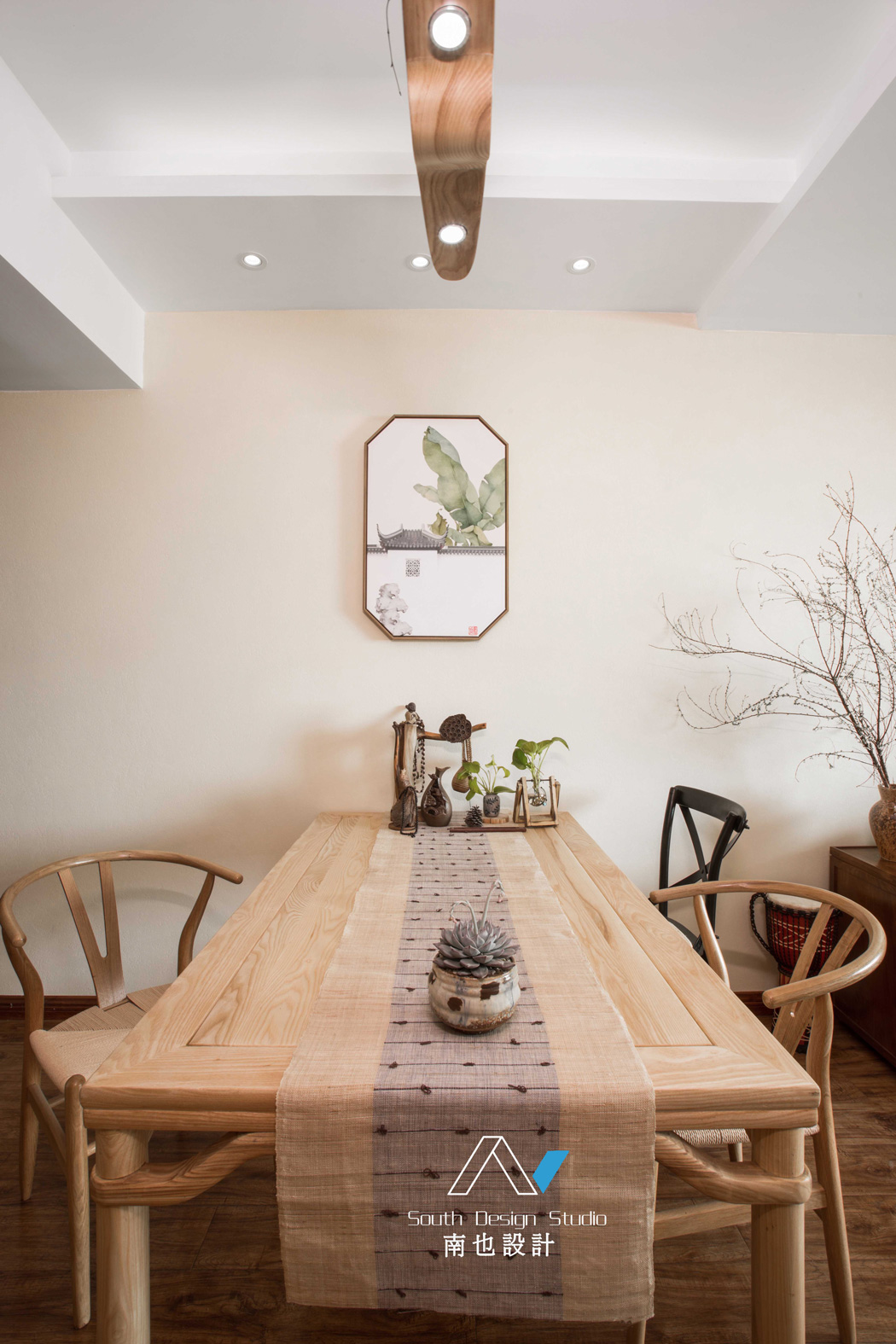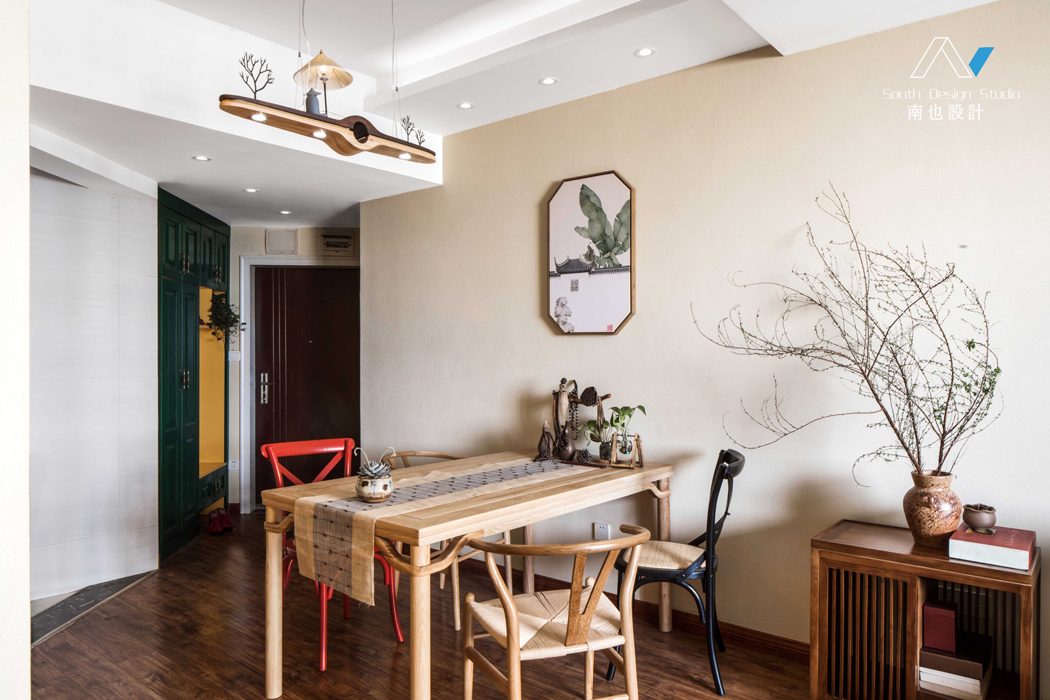 餐厅区域,布局上没有特别大的变动,原设计桌子偏美式,后来业主选了一款中式的桌子,配两款不同的椅子。原因是,在家吃饭不及和朋友在家喝茶的时间多,这样变更后,朋友来家中喝茶,便有了一个喝茶的区域。