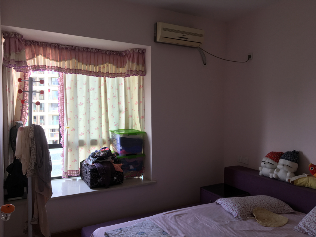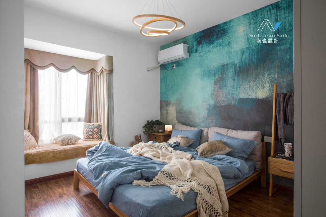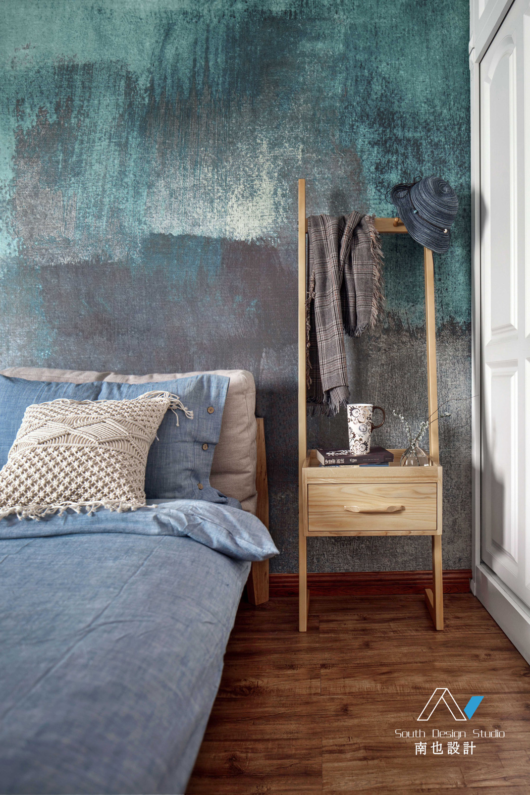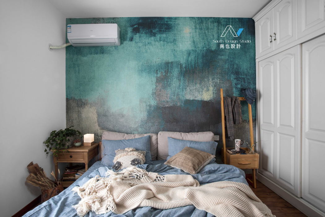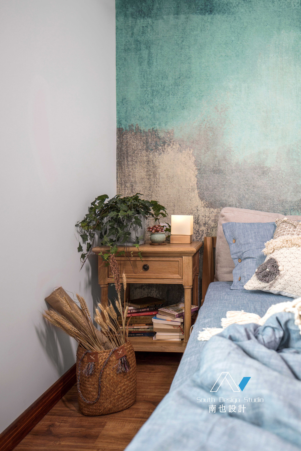 原主卧室只刷了粉色乳胶漆,新的家具为了和旧的衣柜更搭,我们把大面积的墙面刷成同样的白色,床头用了一张无缝壁纸,像油画的笔触。