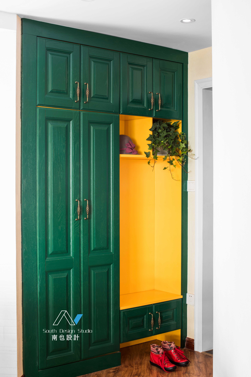 进门的玄关处,由于采光井的采光几乎不起作用,于是封闭了做成整面墙的鞋柜,用墨绿撞亮黄色,给人视觉上的冲击力。镂空的换鞋凳设计让玄关的空间尺寸看起来不那么拥堵。
