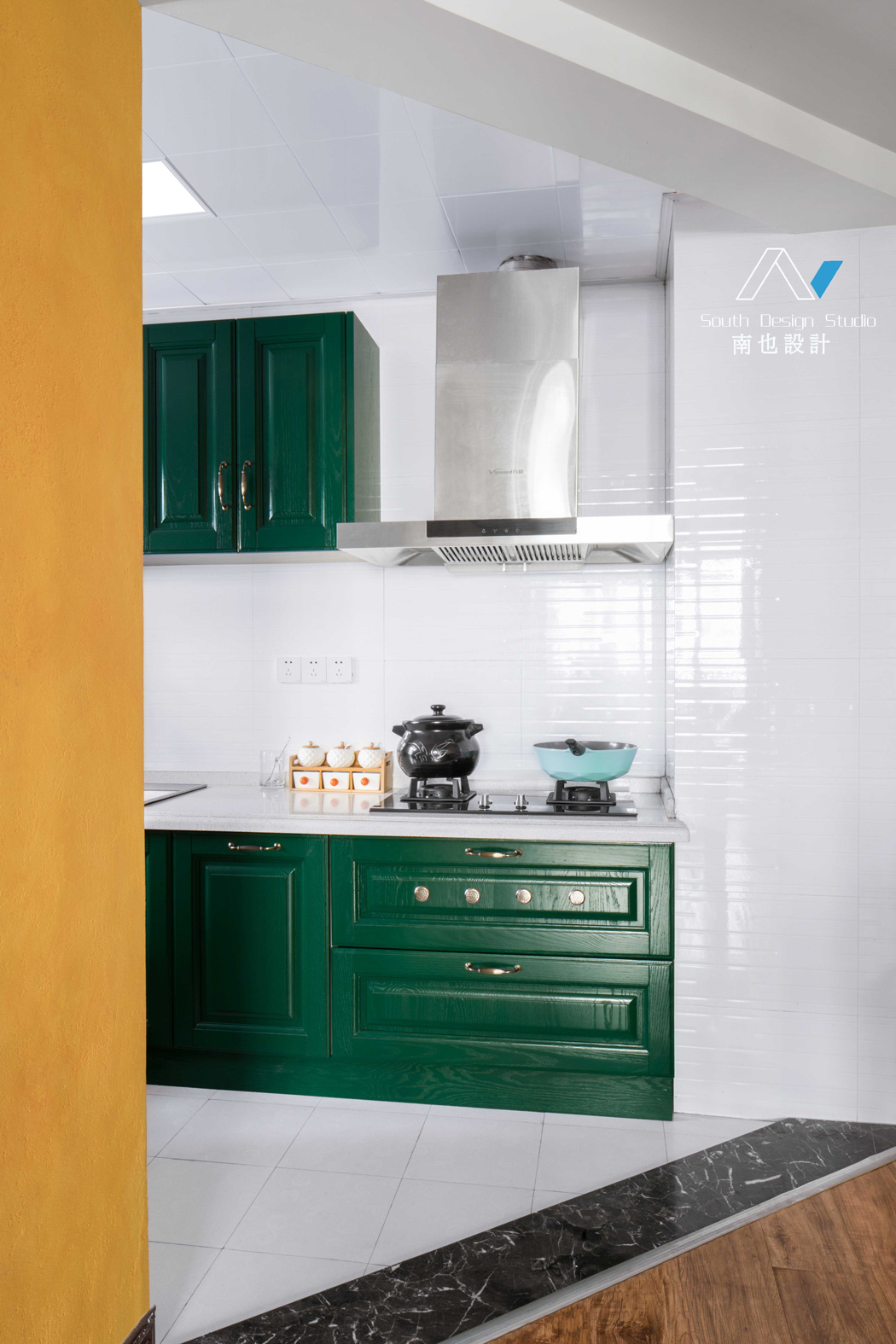 阳台,加上业主平时很少在家做饭,变换位置后,开放式厨房显得更大。玄关到厨房和餐厅,动线也更加合理。而在厨房设计上,保留橱柜原柜体保留,把橱柜柜门换成了和鞋柜同样的墨绿色,让这块域的色彩更统一。