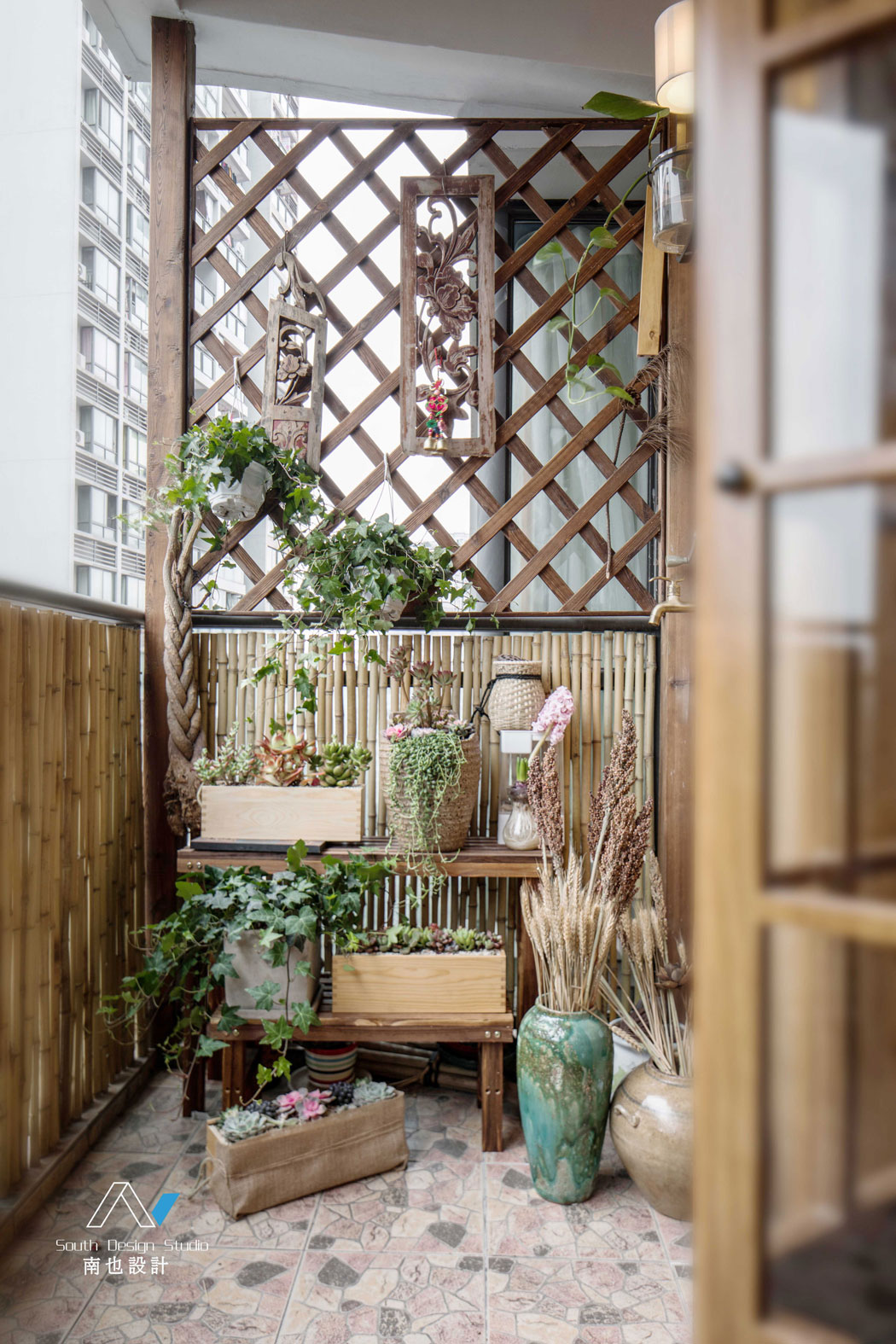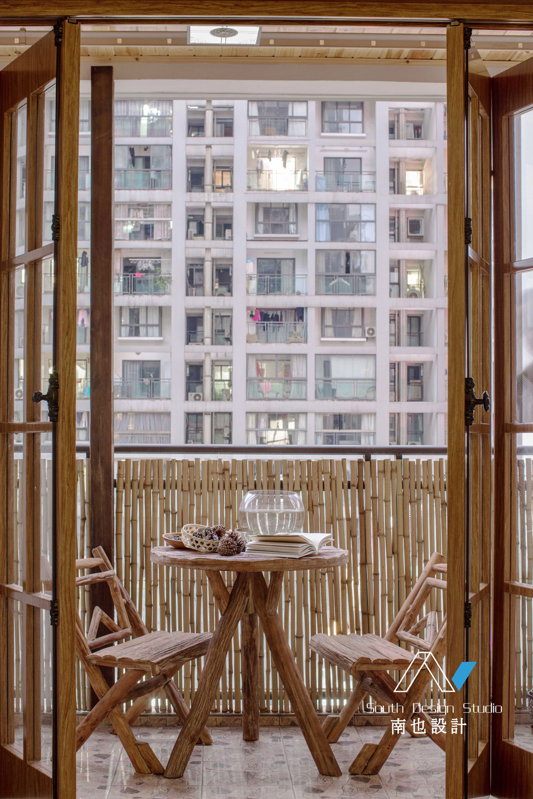 阳台墙面全部用木板和经过防腐处理的竹子包围,在方寸之间也能有一片小资情调的天地。