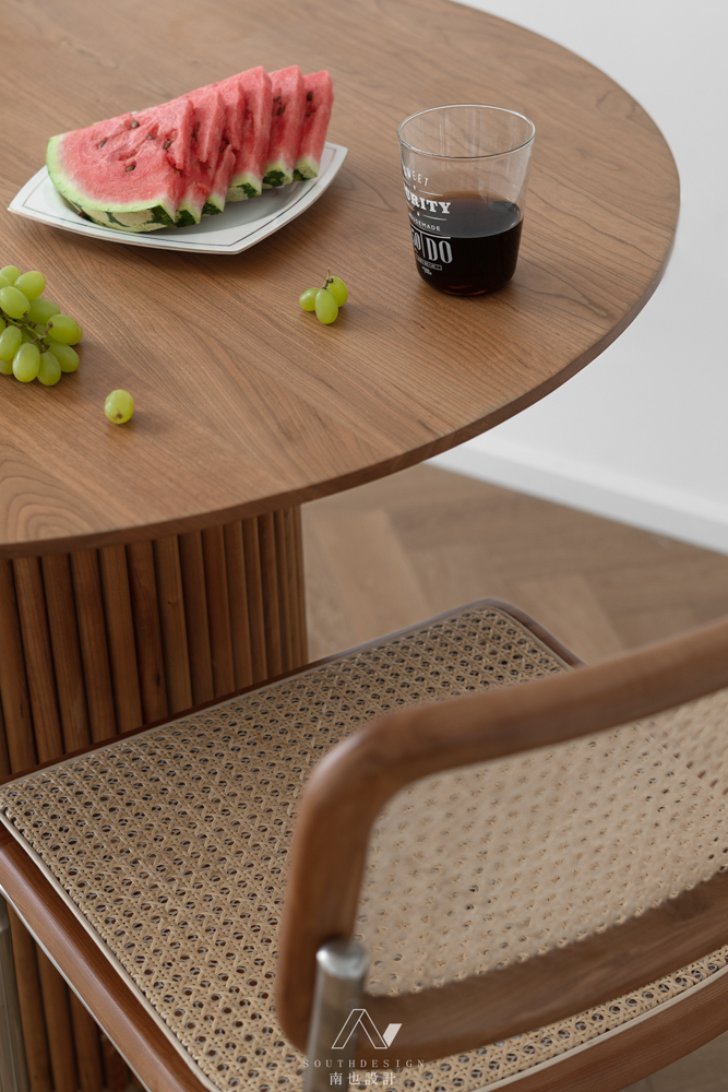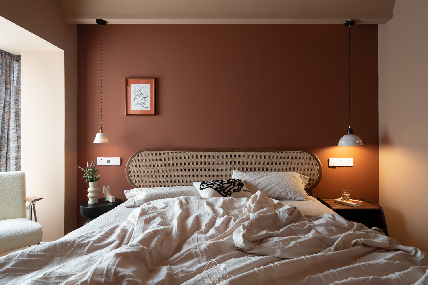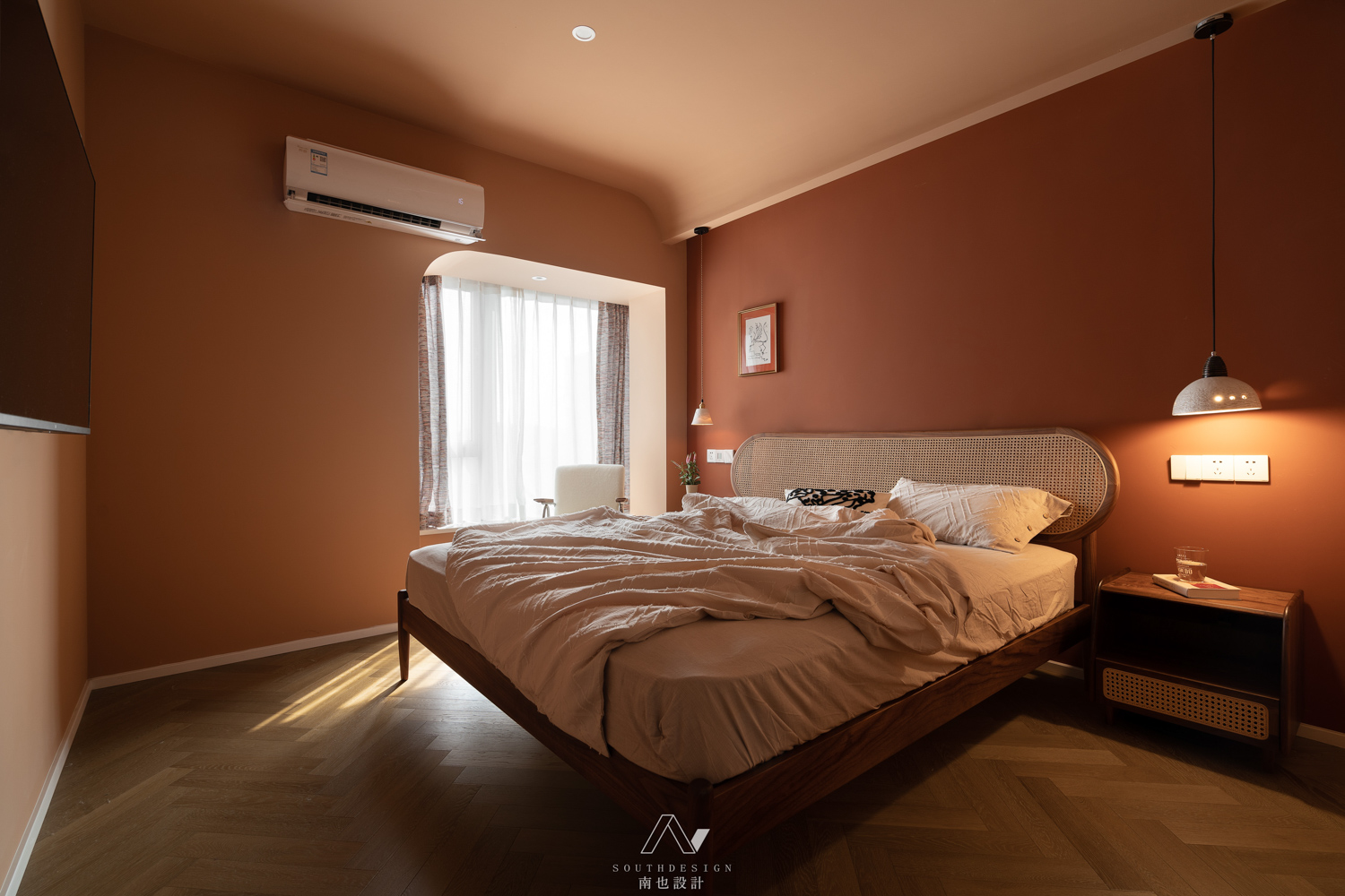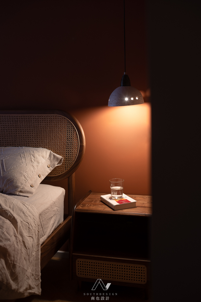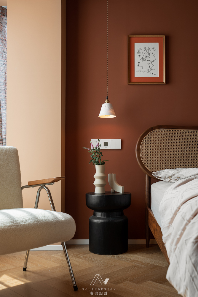 和客厅的素净相反,主卧室像是落霞在沙漠中的余晖,又像是秋日层林尽染的漫山红叶。质朴的藤编床,让晚睡的人有种安定的包围感。
