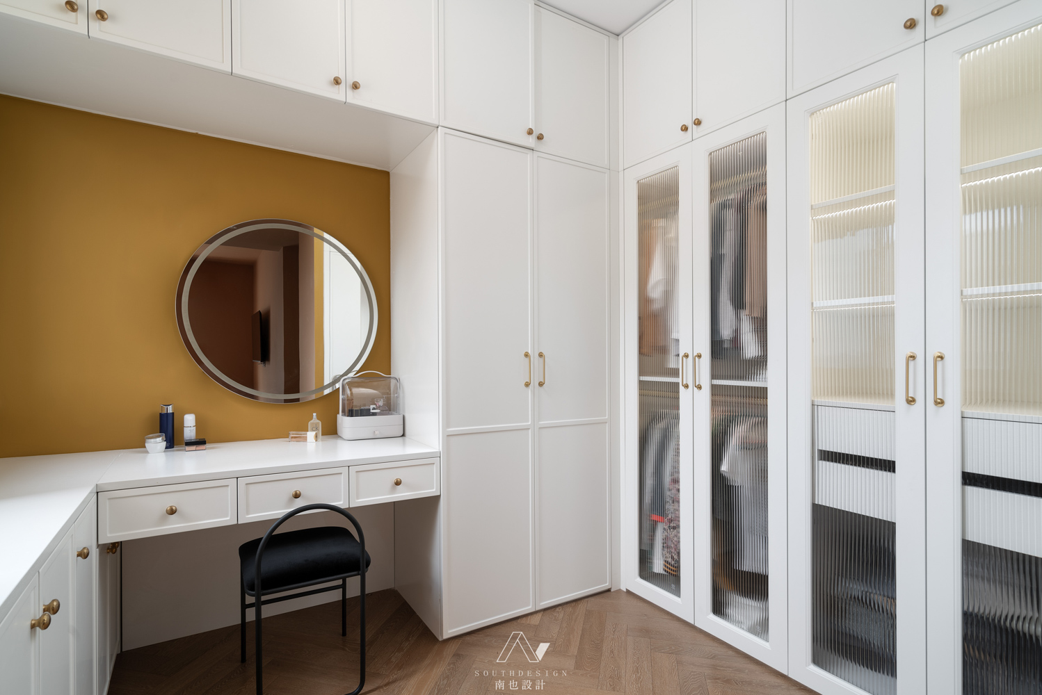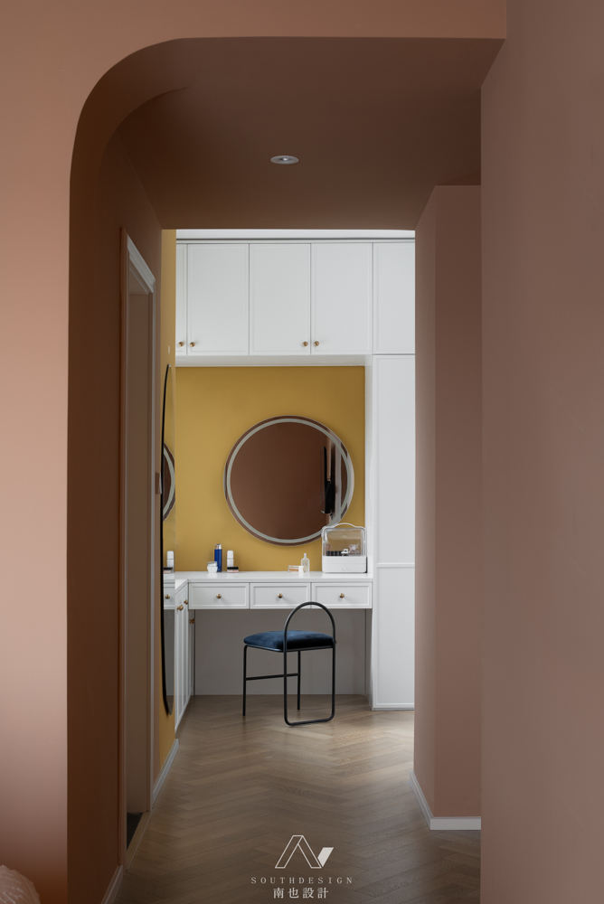 把原本的客房合并在主卧内,透过半弧的门洞,形成了独立的衣帽间。白色的柜体和若隐若现的玻璃门,像吹破可弹的肌肤。