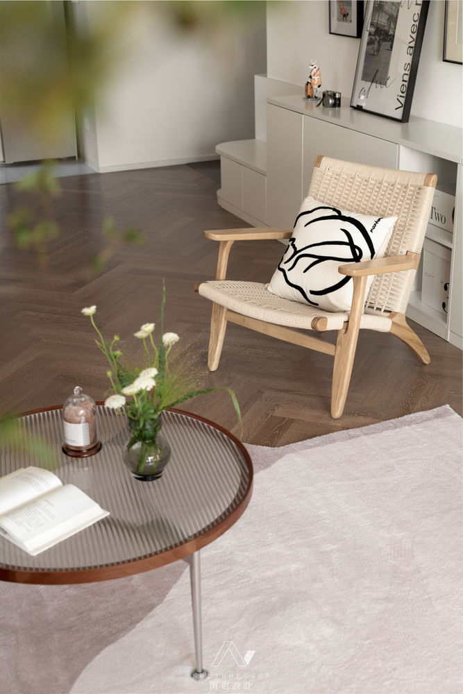 柚木色人字拼地板散发着vintage的味道,同时也能延伸客厅的长度。
