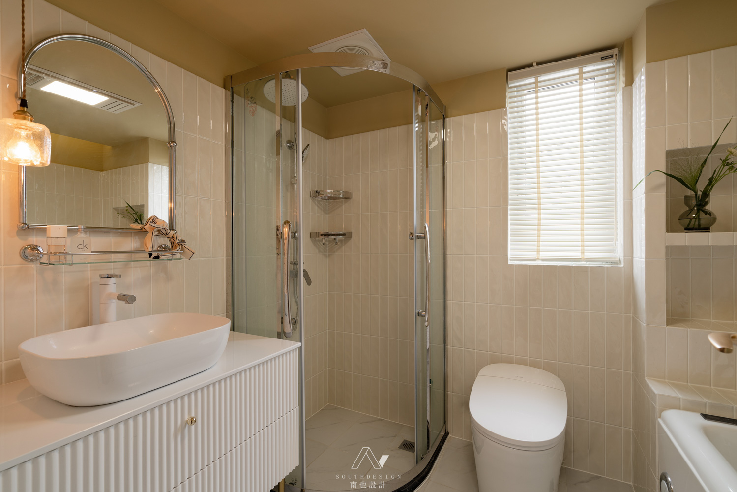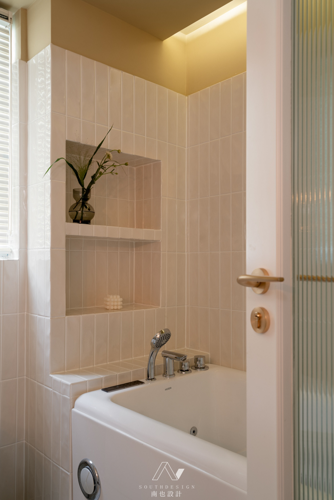 主卫夹在卧室和衣帽间之间。扩大后的尺寸,正好摆放一个按摩浴缸。波浪纹的墙砖,和青黄色的墙面,像是沙漠中的绿洲。弧形的反复运用,突出女性柔美的特征。