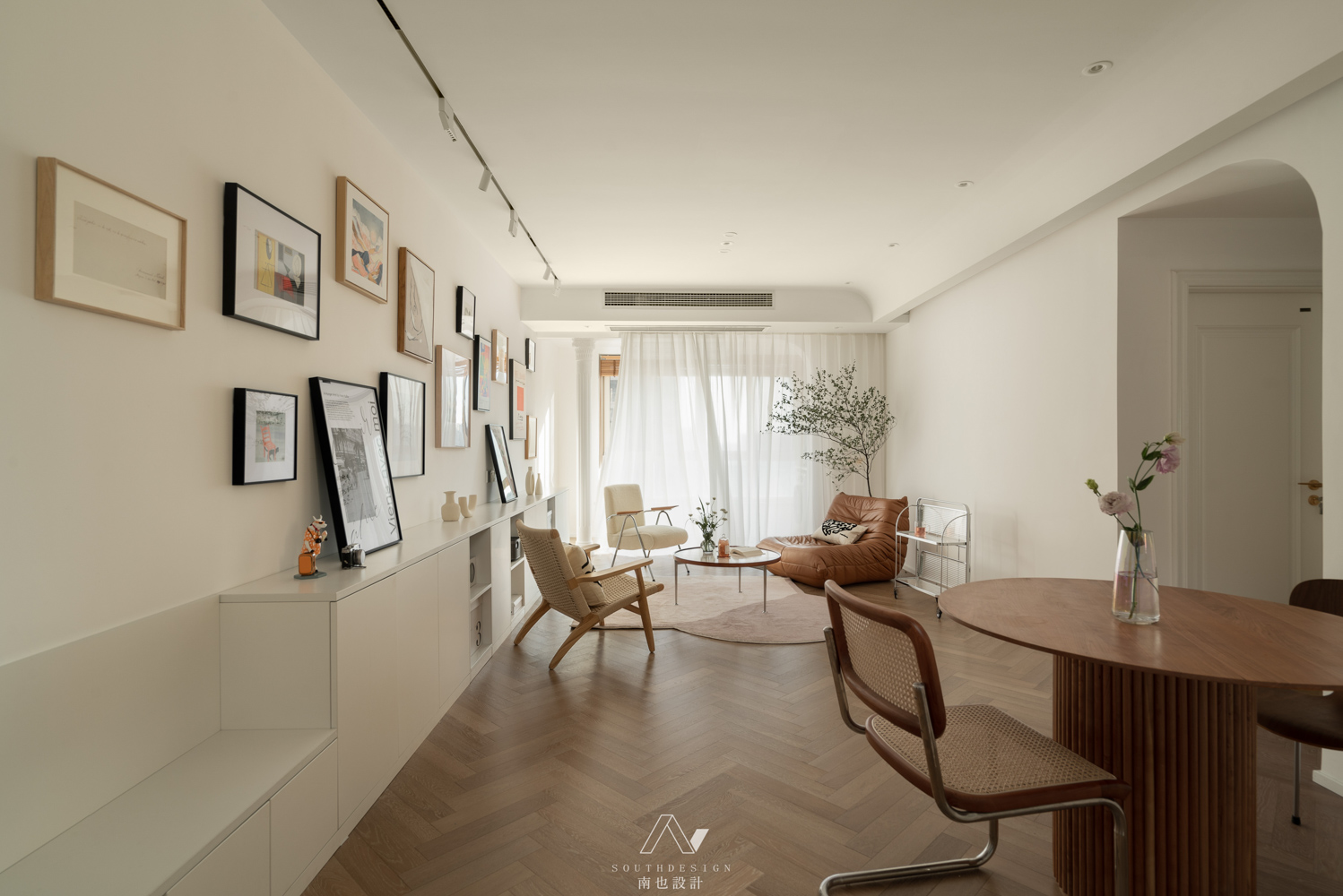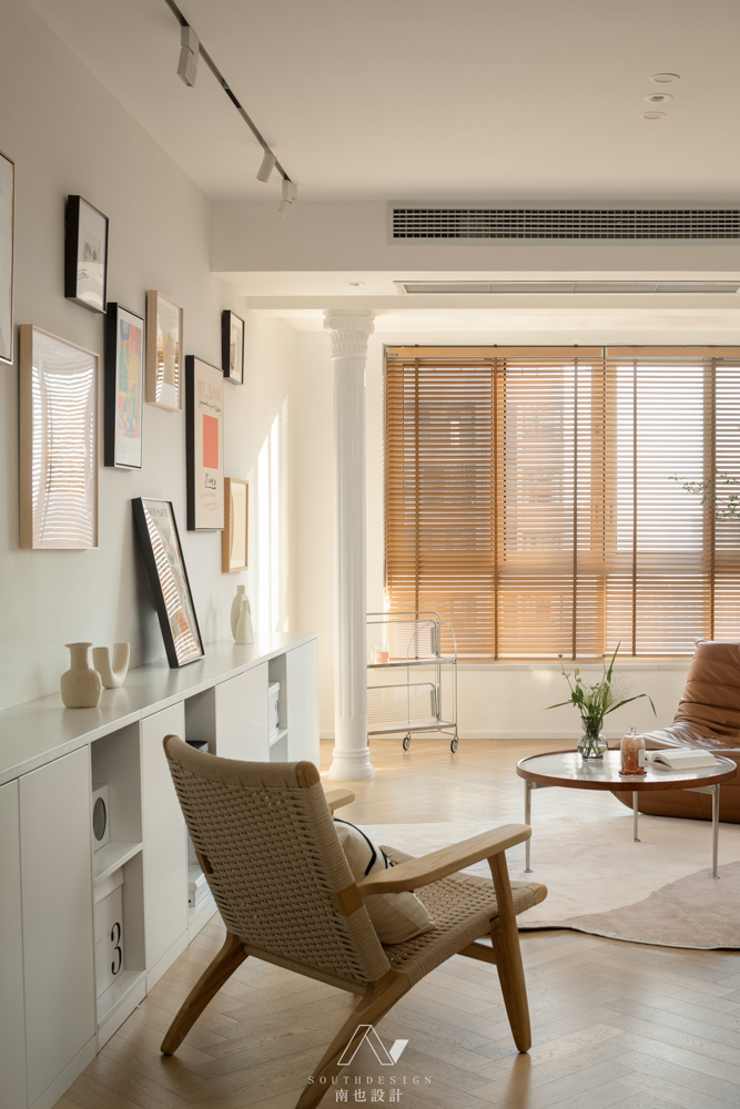 客厅的白不止于简单的留白,而在不断变换的场景模式和生活记录有不一样的“余地”。从进门的一侧延伸至整个客厅的储物柜,弥补了玄关收纳的不足。