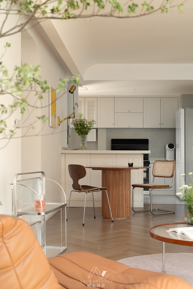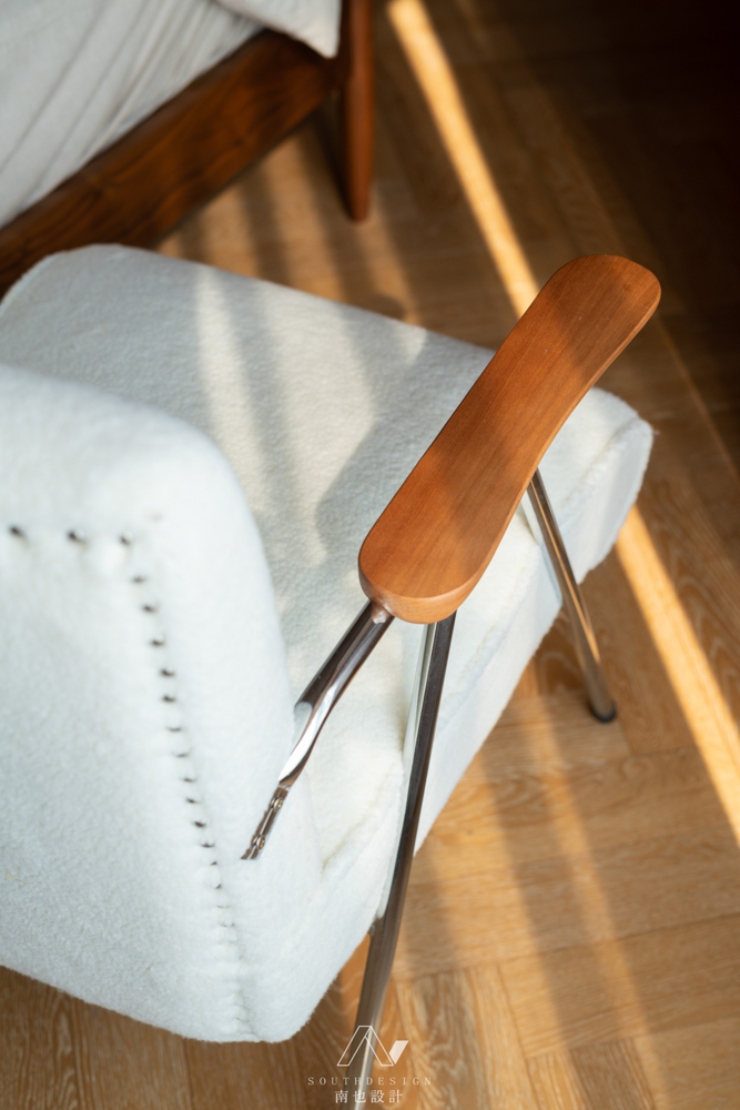 洁白,是留给整客厅最无垠的美,通过曲线和半圆弧元素,柔和原本结构上的硬朗,让人在方框中挣脱束缚感。尽管摆放了沙发,但一改往常大沙发围绕着电视为中心的布局,通过三个不同的沙发围合成轻松不拘一节的氛围。