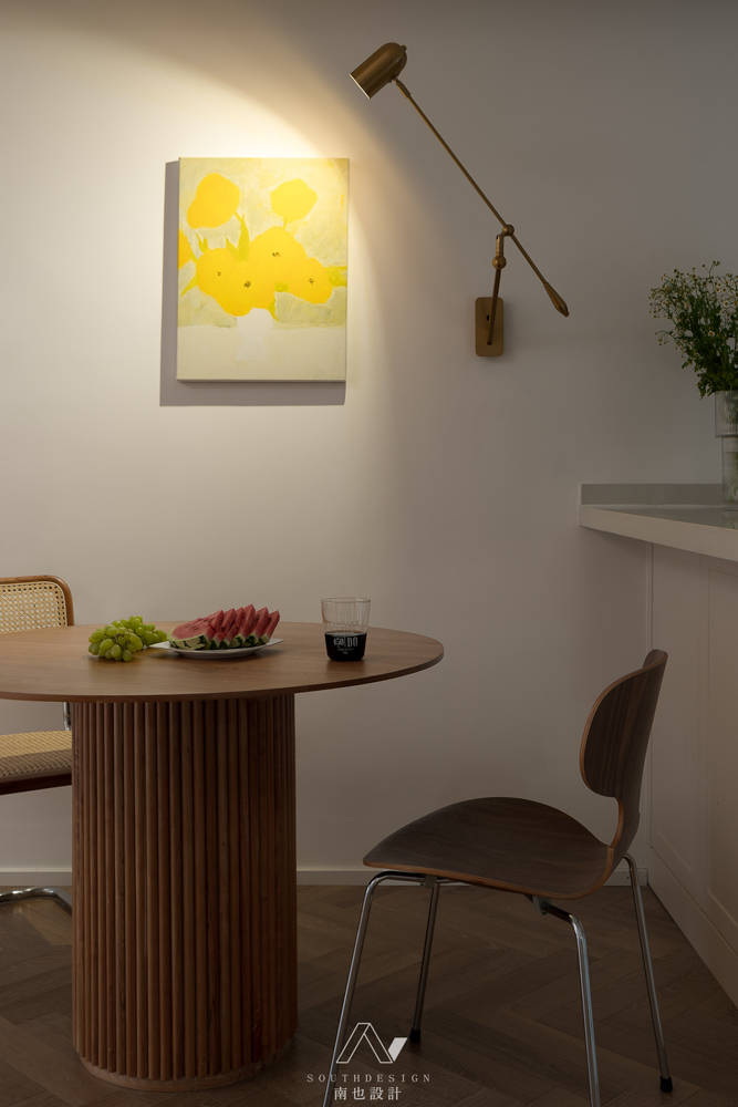 餐厅的圆桌,是为了和空间的曲线相对应,细细观察,餐桌的腿和阳台的罗马柱也有异曲同工之妙。金色的摇头壁灯,可以在餐厅和吧台之间切换使用。