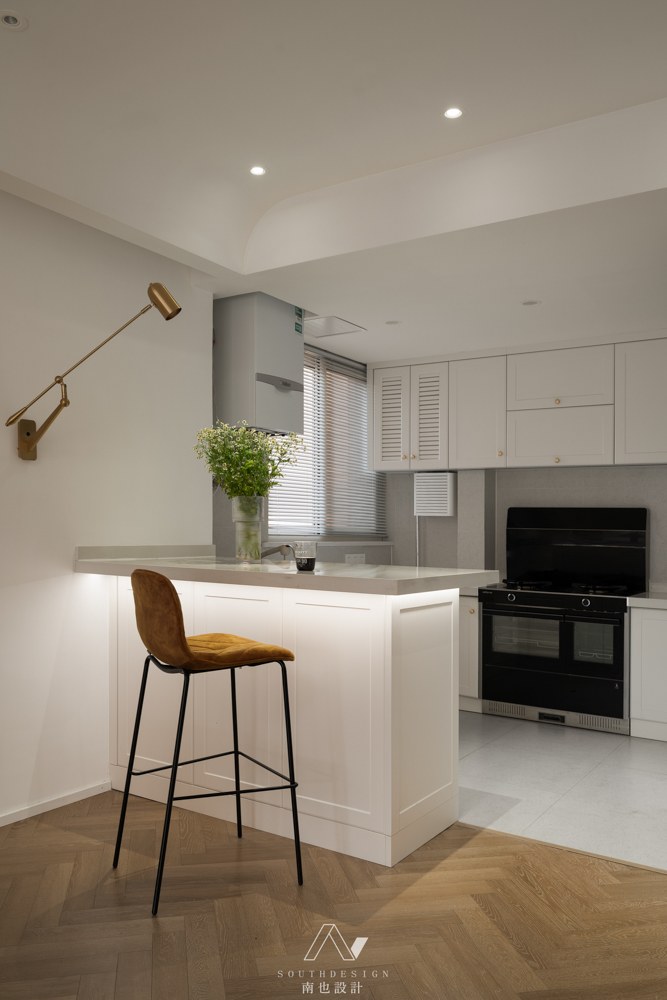 平时在家就餐的人不多,朋友偶尔来聚会,厨房和餐厅的之间有一定的社交功能。打开吧台的灯带,即便一个人就餐,也有一种浪漫的仪式感。